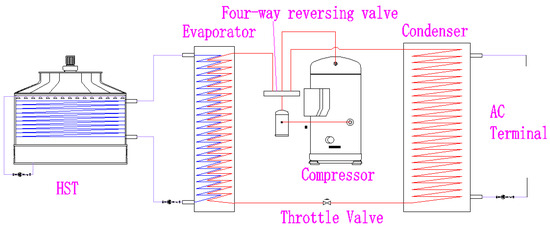 As shown in Figure 1, the HsTHPS is mainly composed of a Heating-Source Tower and a heat pump unit (HPU). The HST is the absorption device that absorbs heat from ambient air. In winter, the antifreeze solution with a freezing point below 0 °C is utilized as the HST medium to extract the low-temperature heat from the air. The medium flows into the evaporator of the HPU and releases the low-temperature heat via the reverse Carnot cycle. This feature of the HSTHPS allows the air to release not only sensible heat but also latent heat from the condensation of water vapor in the air, indicating that the HSTHPS possesses potential in humid areas. In summer, when the HST medium is replaced by water, the HST connects with the condenser of the HPU to realize better heat dissipation. From the perspective of a heat source, the HSTHPS is one type of an ASHPS. Compared to the traditional ASHPS, the only difference is that the HSTHPS includes a heat transfer between the HST medium and ambient air. Based on the HPU type, the HSTHPS is also a derivative of the W/GSHPS [8].