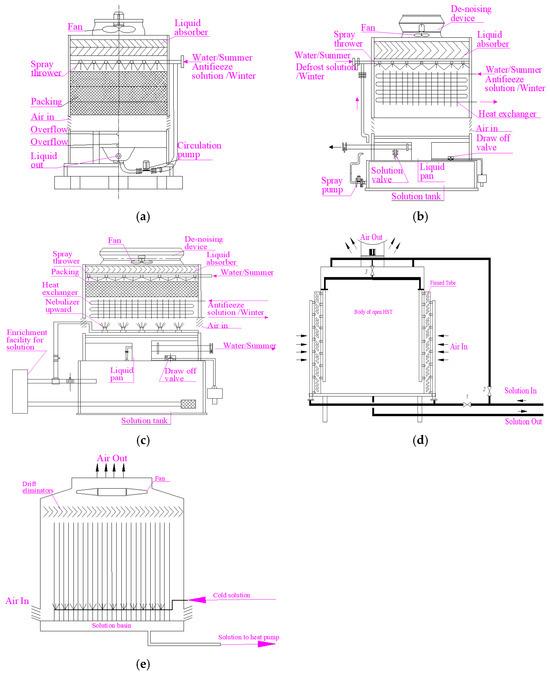 Different structures of HSTs: (a) open HST; (b) closed HST; (c) improved HST; (d) open HST with pre-condensation; and (e) open HST with upward spraying and non-packing.