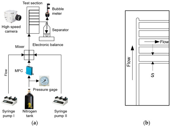 Figure 1a presents a detailed schematic of the experimental setup. Nitrogen gas was sourced from a tank, with its flow rate meticulously regulated by a mass flow controller (MFC, CMQ-V9500, Azbil Corporation, Tokyo, Japan). Liquid delivery was achieved through two precision syringe pumps (LSP02-1B, Longerpump Corporation, Baoding, China), allowing for precise control over the liquid flow rates. These gas and liquid streams were combined in a micro-cross mixer (dimensions 0.6 mm by 0.4 mm) to create the two-phase flow. To ensure the flow was fully developed, the mixer’s downstream outlet was linked to the header of the test section via a channel, the length of which was 100 times its diameter. Upon exiting the test section, the two-phase flow was directed into six separate gas–liquid separators. The flow rate of liquid from each branch channel was determined by measuring the weight increase of the discharged liquid over a set time period using an electronic scale (BSM-120.4, Shanghai Zhuojing Electronic Technology Co., Ltd., Shanghai, China). The gas flow rates at the outlets were ascertained using bubble meters. The flow behavior within the transparent micro-channels was visualized using a high-speed camera (Phantom VEO 410L, Vision Research Corporation, Birmingham, Alabama, USA) operating at 10,068 frames per second with a resolution of 1024 × 512 pixels.
