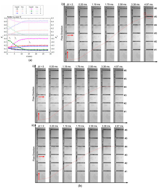The process of varying of the flow distribution in parallel channels and the corresponding flow structures in the header at different times and the typical flow behavior of a liquid bridge (red dotted line) in a period in case 3 (Jl = 0.21 m/s, Jg = 7.08 m/s). #1–6 are the channel numbers starting from the fluid inlet direction and the red arrows show the flow direction in the channels. (a) The process of the varying of flow distribution in parallel channels in case 3 (Jl = 0.21 m/s, Jg = 7.08 m/s); (b) The corresponding flow structures in header and the typical flow behavior of a liquid bridge in a period: at t1 = 1 min (i), 5 min (ii), and 15 min (iii).