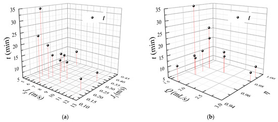 Figure 4 shows the effect of the inlet conditions on the duration (t) of the flow distribution varying. It can be seen from the figure that it takes less time for the distribution to be stable with an increase in the inlet liquid superficial velocity, the gas superficial velocity, and the volume flow rate. In addition, the decrease in the volume fraction of gas can shorten the unstable time. This means the increase in the liquid superficial velocity plays the main role in shortening the unstable time, while the increase in the gas superficial velocity will matter when the liquid remains unchanged. This is because when the inlet liquid and gas velocity increase, more liquid and gas are delivered into the test section and the balance of the pressure between the branches can be achieved quickly; therefore, the unstable time becomes short. However, it is not able to make a large influence with only a limited increase in the gas phase due to the low momentum compared with the liquid phase.