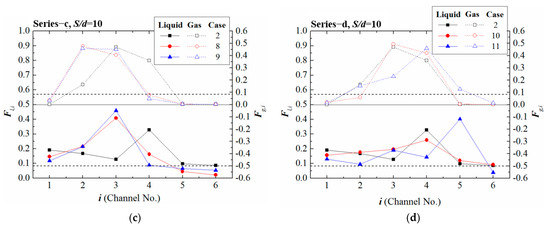 As illustrated in Figure 5a, the liquid highly supplies channel #5 and moderately feeds the rest of the channels with a low inlet liquid superficial velocity, while it tends to feed the channels at the front part of the header with an increase in the liquid superficial velocity. The gas phase is mainly aspirated by the adjacent upstream channel of the one that is highly fed by the liquid phase. This agrees with the observed phenomenon shown in Figure 6a. The liquid column at the end of the header becomes longer with the increase in the inlet liquid superficial velocity, which facilitates the liquid to fill with the channels at the front part of the header. This is similar to the measured and observed results in series-c in that the liquid tends to be taken by the channels at the fore part of the header gradually with the inlet volume of gas decreasing, as seen in Figure 5c and Figure 6c, whereas as the header gas superficial velocity or volume flow rate increases, more liquid flows through the channels at the rear part of the header while the channels in the fore part of the header tend to be badly fed. This trend is consistent with the flow structures in the header observed, as seen in Figure 6b,d. Moreover, the distribution characteristics of the gas phase are the same as that in series-a and series-c.
