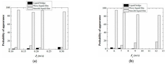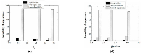 As mentioned in Wang et al. [34], the slug–annular flow was a compound flow pattern, which includes three sub-patterns, like a liquid bridge, wavy liquid film, and smooth liquid film, which are classified based on their different flow forms and momentums fluxes. In addition, the momentums of three sub-patterns could be sorted in descending order: liquid bridge > wavy liquid film > smooth liquid film, which had a significant effect on the liquid distribution, and the appearing probabilities of the three sub-patterns were related to the phase distribution. It is necessary to obtain the statistics of the appearing probabilities of sub-patterns. Therefore, the probability of the appearance of three sub-patterns in these experiments was also obtained (Figure 7). It is observed that increasing the appearing probabilities of the liquid bridge decreases the liquid mass fraction in the channels at the rear part of the header. This is because the liquid with a higher momentum prefers to stay in the header and enters the last few channels at the header while plenty of liquid blocks those channels and increases the pressure decrease, and then the liquid flows into the front channels gradually with the increasing appearing probabilities of the liquid bridge. Moreover, the wavy film has the same effect as the liquid bridge. Therefore, in series-d, the liquid tends to feed the channels at the rear part of the header when the inlet volume flow rate increases, although the probability of the liquid bridge remains unchanged. Conversely, it is notable that each liquid bridge contains much more liquid than each wavy film, and the effect of the former is dominant when they go against each other. In addition, since the smooth film has the lowest momentum, most of the liquid film can be divided into the branch channels at the fore part of the header.