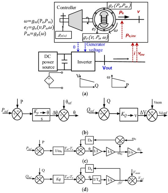 Figure 2. Functional diagram and emulation of virtual synchronous generator. (a) GFM representing virtual machine characteristics; (b) Active and reactive power droop controller; (c) Simplified swing-based virtual synchronous generator; (d) Reactive power voltage droop control law.