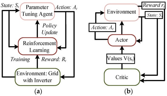 Figure 8. (a) The structure of policy-based algorithm and (b) actor–critic algorithm.
