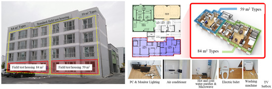 The measurement error and hardware operation status of each instrument and sensor of the prototype developed in this study were reviewed through preliminary experiments. The measured values of the Energy Smart Device were compared with a calibration standard device with higher precision and accuracy to verify the homogeneity and performance of the product for power measurement. The calibration AC power meter was the PM 3000A model from VOLTECH (Abingdon, UK). In addition, the temperature and humidity sensors were checked for measurement errors under temperature and humidity conditions in a constant temperature and humidity chamber. In the case of the human body sensor, the measurement error depending on the position of the human body sensor was also reviewed in advance. The reliability of the i-HEMS measurements was preliminarily validated. Figure 3 shows the exterior and floor plan of the standard house test building and the installed appliances.