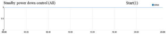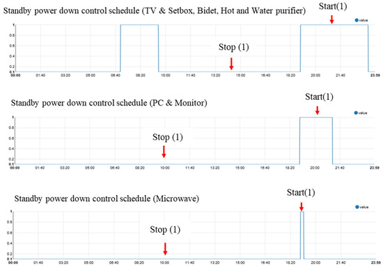 The i-HEMS performs priority management based on user behavior analysis and power plug control. The system detects the first user’s event. For instance, it identifies user interactions with household appliances like light switches, televisions, and personal computers. Additionally, it senses human presence using dedicated sensors. Energy-efficient devices achieve this by analyzing historical power consumption patterns and applying predefined rules. Figure 4 shows the sequence of shutting off the standby power and entering standby mode according to human recognition and user demand. In the case of the TV and Setbox, PC and Motor, Microwave and Washing machine, the standby power was programmed to be cut off if the power consumption of the object device was 12 W or less twice during the three-day study period. That is, the user’s behavior was considered as ON when the user did a specific behavior, and as OFF when the user finished a specific behavior. Figure 3. Shows the i-HEMS flowchart of standby power reduction mode. For the electric bidet and water purifier, we set the same time based on the TV usage time when the room is occupied. It checks the minute-by-minute power usage history of the electronic device and judges that the device is used if the power measurement of 12 W or more is recorded for each minute, and judges that the device is not used if the measurement is less than 2 W. In addition, among the recently used data, if the measurement is used for each minute, the schedule for that minute is judged to be ON, and if the measurement is not used, it is set to OFF and saved. Figure 5 shows the operation signal before applying the standby power cutoff algorithm. In the case of the water purifier, it was observed that the power consumption varied significantly depending on the product operation logic to continuously store hot and cold water in the tank at a certain temperature. Figure 6 shows the power consumption change in a water purifier that is always running. In this study, an automatic learning pattern was applied. Figure 7 shows the system operation schedule derived through device learning in the test-bed. It can be seen that the operation of home appliances by occupants was concentrated in the morning before work and after work. This operation pattern was reflected in the i-HEMS, and the i-HEMS was programmed to cut off standby power through the energy smart device hardware control during the period when the system was off.