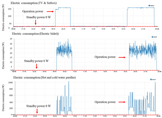 By identifying the behavioral patterns of the residents of the demonstration house over a three-day period, we compared the power consumption before and after the application of the behavioral pattern analysis algorithm. Figure 8 shows the change in power consumption by applying the behavioral pattern algorithm for each home appliance over the course of a day. According to the user’s behavior pattern, the standby power was turned off when not in use, and the power consumption was measured as 0 W. It can be seen that the change in power consumption of the water purifier in Case 1 in Figure 6 changed significantly from the change in power consumption in Case 2 in Figure 8.