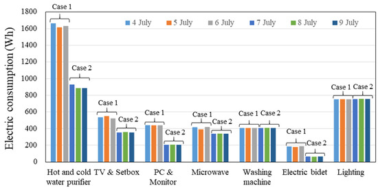 Table 3 shows the electricity usage of each appliance for 3 days in Case 1 before the algorithm was applied and 3 days after the algorithm was applied in Case 2. The device with the largest reduction in electricity usage was the water purifier, which was reduced by 54% from 4904 Wh in Case 1 to 2694 Wh in Case 2. The power consumption of the TV and setbox, PC and monitor, and Microwave, which are subject to base load, also showed a significant reduction. The electric bidet, hot and cold water purifiers, and electric devices that require temperature control with a ‘curtailable load’ were the most significant contributors to the reduction in power usage. In contrast to the constant use of electricity even at night when users were not using it, i-HEMS’s user pattern recognition allowed it to cut off the power when not in use, significantly reducing power consumption. Figure 9. shows the results of daily power consumption. The washing machine and lighting, with the same usage time and frequency, did not change in power consumption. However, the reduction in power consumption varied among devices with different usage loads, depending on the duration of use and operating conditions.