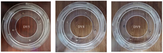 This article focuses on the centrifugal pump with a vaned diffuser operating, and its main parameters are shown in Table 1. Three vaned diffusers with different numbers of blades are proposed to investigate the impact of the rotor–stator matching mode on the complex flow field and pressure pulsation characteristics, with the impeller unchanged. The design of the vaned diffuser should guarantee the pump’s performance almost unchanged under the three blade numbers. Finally, it is determined that only the number of vaned diffuser blade Zs is changed, which are selected as Zs = 5, 8 and 9 for the three model pumps named as DY5, DY8 and DY9, respectively, as shown in Figure 1.
