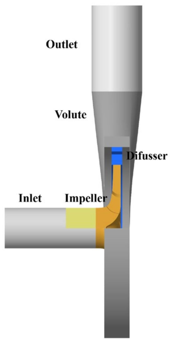 The geometric model of the model pump calculation domain is established as shown in Figure 2, where the impeller is the only rotating domain of the model pump.