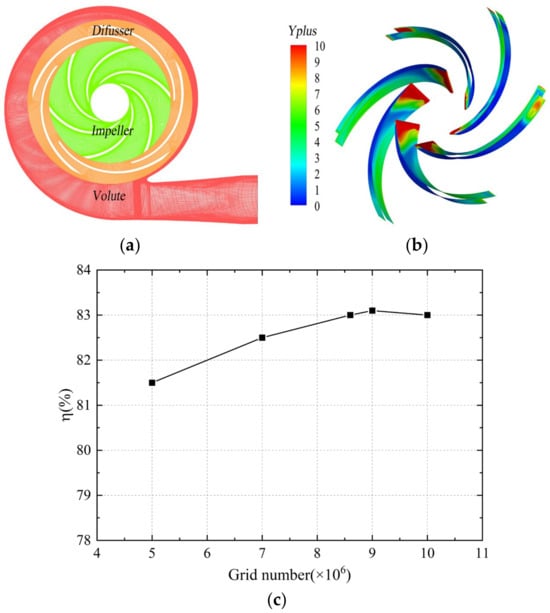 The mesh for each flow component was generated separately using ANSYS-ICEM, as shown in Figure 3a. Hexahedral structured meshes were utilized in the fluid domain with boundary layer refinement applied to the impeller surfaces, as shown in Figure 3b, where the average Y+ value on the blade surface was around 5.0, meeting the requirements for near-wall treatment. Mesh independence verification was conducted. Five different mesh grids from 5 million to 10 million were compared. It was observed that, when the total grid number reached 8.6 million, further increasing the mesh count resulted in minimal change in the efficiency, satisfying the criteria for mesh independence verification, as shown in Figure 3c. The efficiency difference was lower than 0.5%. Considering the calculation resources needed, a total grid number of 8.6 million cells was selected for the numerical simulation.