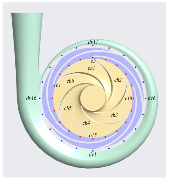 By arranging monitoring points at typical positions in the model pump calculation domain, the pressure pulsation characteristics inside the centrifugal pump were studied. Figure 4 shows the layout of the monitoring points for model pump DY5. Twenty monitoring points were evenly distributed in the gap between the impeller and the vaned diffuser of the model pump to analyze the rotor–stator interaction excitation characteristics of three model pumps. Along the circumferential direction at the exit of the vaned diffuser, twenty monitoring points were evenly distributed to obtain the pressure pulsation characteristics at the exit of the vaned diffuser. The arrangements of monitoring points in the vaned diffuser passage for model pumps DY8 and DY9 were consistent with DY5.