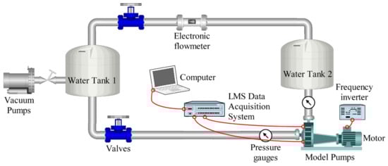 The closed test system of the centrifugal pump, as shown in Figure 5, was constructed. The flow rate and pump head were obtained using an electromagnetic flowmeter and a high-precision pressure gauge, while the input power of the pump was obtained using a torque meter. The error of the entire testing system was less than 0.5%. In order to obtain the spectral characteristics of the model pump under different operating conditions, a high-frequency pressure pulsation sensor (PCB113B27) was used to collect pressure signals. Due to the pump speed of 1450 r/min on this test platform and the maximum excitation frequency being lower than 1000 Hz [27,28], the spectrum bandwidth during the sampling process was set to 6400 Hz, and the sampling resolution was set to 0.5 Hz. The sampling time was 3 s and the time interval was 0.5 s to fully satisfy the Nyquist sampling theorem.