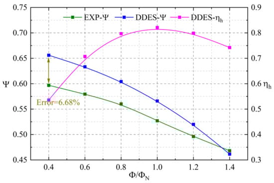 Figure 6 shows the head error between the experimental and numerical calculations of the DY5 model pump to validate the accuracy of the DDES method. It can be observed from the pump efficiency curve that the optimal efficiency point is located at the rated operating condition, with a maximum hydraulic efficiency of 82.4%. From the pump head curve, it is evident that the calculated head matches the experimental result. At 0.4 QN, the maximum error between the numerical calculation and experiment is 6.68%, which may be related to the leakage fluid between the impeller and the volute. The error at the design condition is attributed to the fact that the numerical calculation does not consider the impact of mechanical losses and leakage losses [29]. Leakage between the impeller and the volute is a significant factor affecting the calculation accuracy, which is not considered during the numerical simulation process.