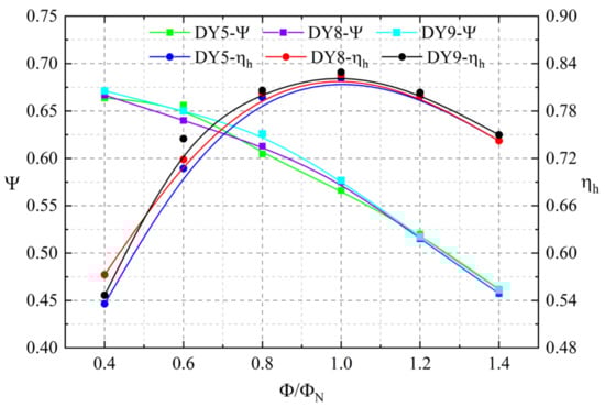 Figure 7 presents the performance prediction curves of different impeller–vaned diffuser matching models. It can be seen from the figure that, throughout the entire operating range, the head and efficiency curves of the three model pumps tend to be consistent with the high-efficiency points, all at 1.0 QN, meeting the design objectives and laying the foundation for subsequent unsteady numerical calculations. Under the design condition, with an increase in the number of vaned diffuser blades, both the head and efficiency increase. The head and efficiency of the DY9 scheme are approximately 2% and 1% higher than the DY5 model pump, as shown in Table 2. It can be inferred from the results that the impeller–vaned diffuser matching mode can affect the hydraulic performance of the pump.