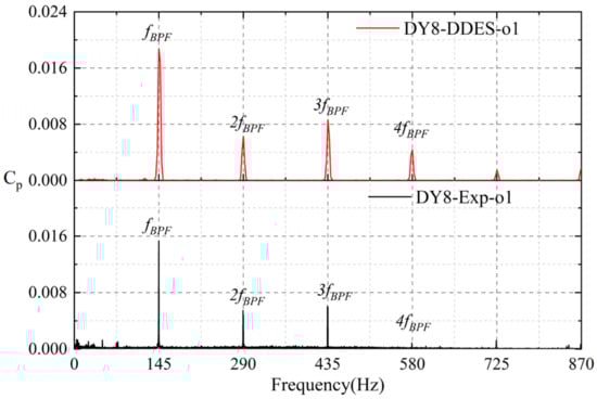 To verify the accuracy of the numerical calculation methods in predicting the pressure pulsation characteristics, Figure 8 first shows the pressure pulsation signals at monitoring point o1 located in the impeller outlet region under the rated operating condition for the DY8 model pump. The spectral characteristics of the numerical and experimental frequencies of the model pump exhibit typical discrete features, with peak signals mainly occurring at the blade passing frequency fBPF and its harmonics of 2fBPF, 3fBPF and 4fBPF, where the pressure pulsation amplitude at the blade passing frequency is significantly larger than at its higher harmonics. The DDES method can capture characteristic frequencies well and generally agree with those captured in the experiment. During the numerical calculations, the monitoring points are uniformly distributed at the impeller outlet. However, discrepancies in the positioning of the monitoring points during manufacturing processes compared to calculations can lead to errors between the experimental and numerical results. Furthermore, the high-frequency pressure pulsation sensor used in the experiment has a diameter of 6 mm, collecting the average value of pressure pulsation signals across the entire cross-section, while the DDES calculation is set for signals at individual points [30], leading to potential errors in the experiment and simulation due to different collection areas. The calculated error between the simulations and experiments at the blade passing frequency is only 18.18%, with errors below 32% at the higher harmonics, as shown in Table 3. Compared to the published literature, where errors in the pressure pulsation amplitude between calculations and experiments often exceeded 50% and even surpassed 100% [31], the calculation error in this study is not large for pressure pulsation prediction. Therefore, this study considers that the DDES numerical simulation method can effectively investigate the complex internal flow and pressure pulsation characteristics of centrifugal pumps.