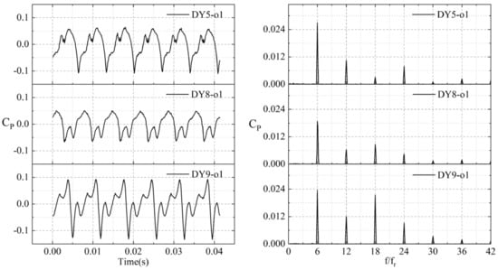 Pressure pulsations inside the centrifugal pumps mainly originate from the strong RSI effect of the rotor and stator. Figure 9 shows the pressure pulsation signal at monitoring point o1 at the impeller outlet for three pumps. The corresponding frequency spectra are obtained after the FFT (Fast Fourier Transform) with the application of a Hanning window in the signal processing. The centrifugal pump studied in this paper has a speed of 1450 r/min, with a blade number Zr of 6; thus, the impeller rotational frequency fR is 24.2 Hz and the blade passing frequency fBPF is 145 Hz. It can be observed from the time-domain spectrum that, due to the strong RSI effect, periodic pressure signals are generated, and the alternating peaks and valleys are determined by the number of rotor and stator blades. In the time-domain plot, typical discrete characteristics are presented, with peak signals mainly occurring at the blade passing frequency fBPF and its harmonics 2fBPF, 3fBPF and 4fBPF. In the frequency spectra of the DY5 and DY8 pumps, the pressure pulsation amplitudes at fBPF are much greater than at their harmonics, while, in the spectrum of the DY9 model pump, the component at 3fBPF is captured.