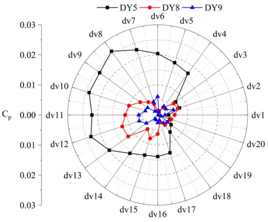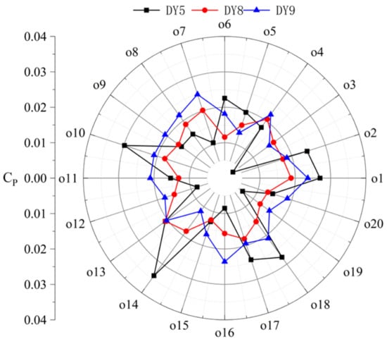 Based on the above analysis, at the impeller outlet, the blade passing frequency signal is the dominant signal of pressure pulsation. In order to compare the effects of the three model pumps on the pressure pulsation signal at the impeller outlet, this study extracted the fBPF of measuring points o1~o20 for each model pump for comparison, as shown in Figure 10. It can be observed from the figure that the DY8 model pump shows a smoother circumferential distribution, with most monitoring points having a blade passing frequency amplitude around Cp = 0.015, without significant abrupt changes. Although the circumferential distribution of the blade passing frequency amplitude at the blade passing frequency for the DY9 model pump is similar in trend to that of the DY8 model pump, its overall blade passing frequency amplitude is greater than that of the DY8 model pump, with the amplitude of most monitoring points around Cp = 0.02, while the circumferential distribution of the blade passing frequency amplitude for the DY5 model pump shows the greatest variation, exhibiting significant abrupt changes. It was calculated that the average fBPF of the measuring points at the impeller outlet in the circumferential direction for the DY5 configuration is 0.018, for the DY8 model pump it is 0.016 and for the DY9 model pump it is 0.019. In summary, among the three model pumps with different vaned diffuser blades, the DY8 model pump exhibits the best suppression effect on the rotor–stator interaction at the impeller outlet, reducing the amplitude by 12% compared to the original DY5 model pump.