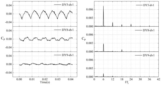 The pulsation characteristics at the vaned diffuser outlet are an important way to judge the effectiveness of suppressing the rotor–stator interaction inside the pump. To analyze the pressure pulsation characteristics at the vaned diffuser outlet, Figure 11 presents the pressure pulsation spectra at point dv1 of three model pumps. Similar to the pressure pulsation characteristics at the impeller outlet, in the time-domain signal, peaks and valleys alternate within one cycle, but the pattern of the DY9 model pump is not obvious. In the pressure spectra, the three model pumps all capture the fBPF, but with different patterns. The DY5 model pump captures higher components at 2fBPF, 3fBPF and 4fBPF. The DY8 model pump captures 3fBPF, while the amplitude of 2fBPF is not significant, and the DY9 model pump does not capture 3fBPF and has a very low amplitude at 2fBPF.