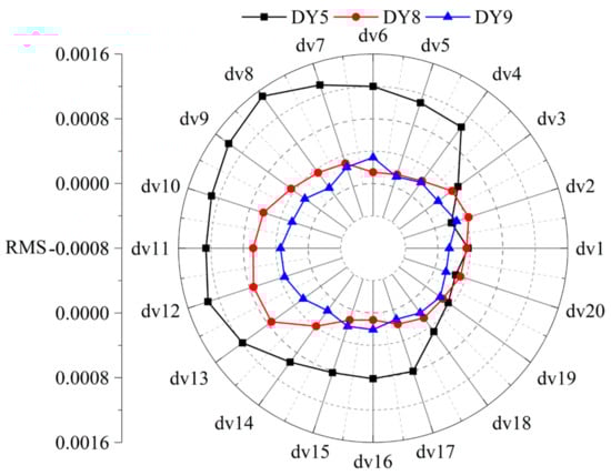 Figure 13 shows the RMS values within the frequency band of 10–1500 Hz for the three model pumps for the points at the diffuser outlet. It can be seen from the figure that the RMS values within the frequency band of 10–1500 Hz follow a similar pattern to the fBPF. The RMS values at measuring points are highest for the DY5 model pump, while the RMS values for the DY9 model pump are distributed evenly and with the smallest amplitudes. Calculations show that the average RMS values at the circumferential measuring points at the vaned diffuser outlet for the DY5 model pump is 0.0008454, and for the DY8 model pump it is 0.0003639. For the DY9 model pump, the RMS value is 0.0002170, resulting in 74% reduction in the amplitude compared to the original DY5 model pump. In conclusion, at the vaned diffuser outlet, the DY9 model pump exhibits the best suppression of the rotor–stator interaction, while the DY5 model pump performs the worst.