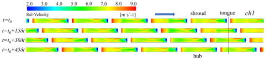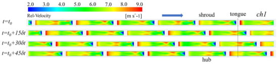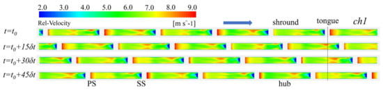 The impeller outlet region is an important area for studying the rotor–stator interaction, and the study of the flow field at the impeller outlet can provide a more intuitive comparison of the flow structures induced by the rotor–stator interaction of the three pumps. Figure 14, Figure 15 and Figure 16 show the evolution process of the relative velocity distribution at the impeller outlet of the three pump models, where δt represents the time step during the numerical simulation. From the figures, it can be observed that all three pump models exhibit distinct high-speed jet regions on the pressure side (PS) of the blade, and a low-speed wake region in the middle position on the suction side (SS) of the blade. Between the pressure side and suction side, the high-speed region adheres to the hub and shroud, with a strip-like high-speed band moving in the passage of the DY5 model pump. During the evolution process of the relative velocity of the model pumps, the high-speed band at hub and shroud of the DY5 model pump gradually stretches and almost fills the entire passage. Although the relative velocity evolution patterns of the three model pumps differ, the flow structures are consistent, and the distribution of the relative velocity along the axial position is similar, all exhibiting distinct non-uniform jet–wake phenomena.