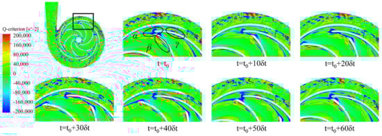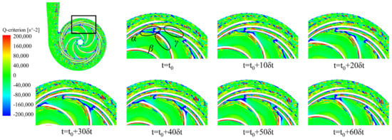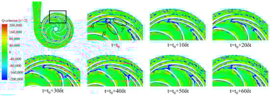 Figure 17, Figure 18 and Figure 19 show the evolution of the vortex structure of the three model pumps in the vaned diffuser under the design working condition. It can be seen from the figures that, at t = t0, the impeller blades of the three model pumps start to sweep the vaned diffuser inlet; at this time, the negative vortex on the trailing edge of the working surface of the impeller blades collides and squeezes the vaned diffuser inlet, where the vortex structure α is formed, and the positive vortex sheet β attached to the suction side of the blade starts to fall off. At the moment of t = t0 + 20δt, the impeller blade sweeps over the vaned diffuser inlet, and the negative vortex on the pressure surface of the blade collides with and squeezes the vaned diffuser inlet and divides into two parts, one part of which enters the impeller–diffuser gap along the vaned diffuser pressure surface, and the other part of which enters the vaned diffuser flow channel. Part of the shed vortex separated from the vortex band β enters the impeller–diffuser gap, and the other part collides and squeezes the vaned diffuser inlet, which has a strong interaction with the vortex α, resulting in high vortex energy near the vaned diffuser inlet. This phenomenon intuitively explains the phenomenon for the three model pumps, proposed above, which have a strong rotor–stator effect at the vaned diffuser inlet and a prominent amplitude of pressure pulsation signals. As the impeller continues to rotate, it is found that, in the process of t = t0 + 30δt~t = t0 + 50δt, the vortex sheet β at the blade suction and the negative vortex at the trailing edge at the pressure side are continuously shed, and the positive and negative vortices separated from these vortexes move to the gap, forming a new high-vortex region, with the collision with the next vaned diffuser to continue the evolution.