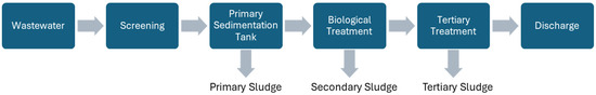 Sewage sludge is generated in the wastewater treatment process, including primary (physical and/or chemical), secondary (biological), and tertiary (which complements secondary treatment, often involving nutrient removal) treatments (Figure 1).