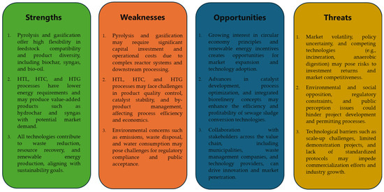 The successful implementation of sewage sludge conversion technologies relies not only on their technical feasibility but also on their economic viability and broader market considerations. This section presents a brief analysis of the techno-economic aspects associated with pyrolysis, gasification, HTC, HTL, and HTG, as potential pathways for sewage sludge valorization. To provide a structured assessment, a SWOT (Strengths, Weaknesses, Opportunities, Threats) analysis framework was employed, offering a systematic approach to evaluating the internal and external factors influencing the feasibility and sustainability of each technology. By examining the strengths, weaknesses, opportunities, and threats associated with these sewage sludge conversion technologies, this analysis aimed to elucidate their comparative advantages, potential challenges, and strategic implications for waste management and resource recovery initiatives. Figure 2 shows this work’s SWOT analysis.