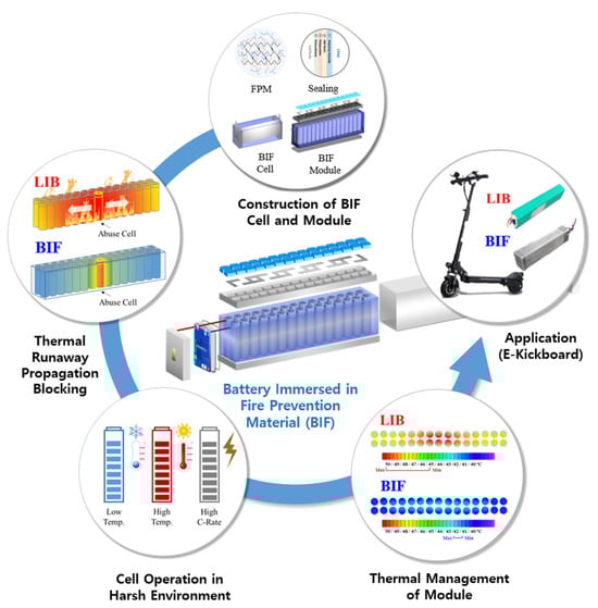 Configuration of the battery immersed in fire prevention material (BIF) and research from the construction of the battery to application in sequence.