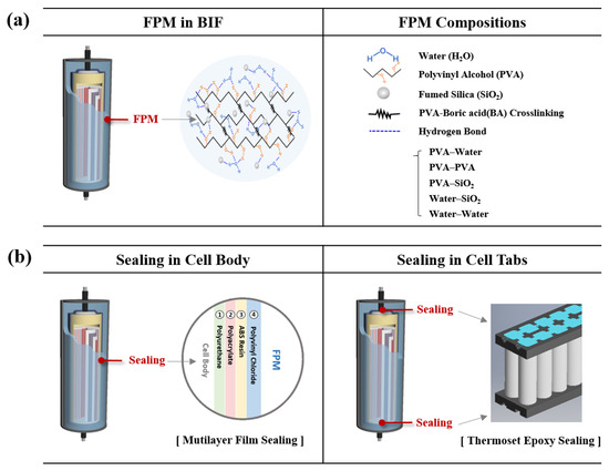 Functional components of BIF: (a) structure and composition of fire prevention material (FPM) immersing the battery, and the application of (b) sealing within the cell body and cell tabs to prevent direct contact of FPM to the battery.