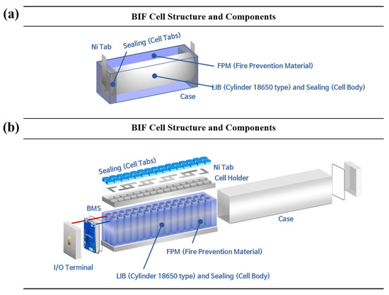 Figure 3 illustrates the construction and components of the BIF cell and module. It comprises the LIB cell and the functional components of the BIF such as the FPM, sealing, and selectively the other components such as the cell holder, case, BMS, I/O terminal, and Ni tab that allow operation. Table 1 and Table 2 provide the specifications of the BIF cell and module, together with its electrochemical parameters [30], such as the battery, BMS, and operating conditions [27,31,32].