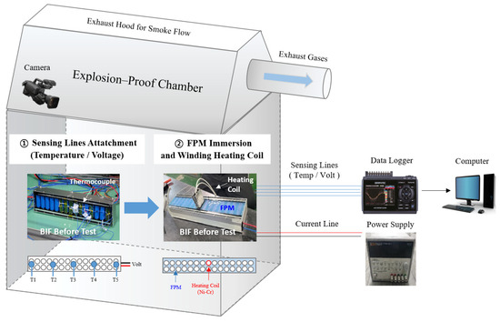 For the next step, to determine the appropriate quantity of FPM to be incorporated into the BIF, the theoretical amount of FPM required to block the fire was calculated. First, the maximum heat energy generated with the LIB short circuit was calculated (Equation (1)). It differs based on the material and type of cell but is usually proportional to the energy of the battery [28,29].