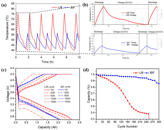 Figure 7c compares the voltage of the LIB cell with that of the BIF cell based on the capacity. In LIB, as the cycle progresses, horizontal and vertical extrapolations occur quantitatively [31,53]. High currents lead to high overpotentials with increasing temperature. The capacity of the LIB cell was better than that of the BIF in the initial cycles owing to the high temperature. However, the capacity of the LIB cell becomes lower than that of the BIF cell after the 100th cycle. Additionally, fluctuations may occur in the early battery charging and discharging processes if the entropic heat negatively affects the driving conditions of certain batteries [31].