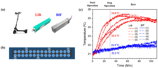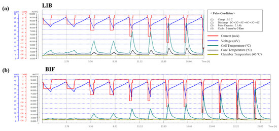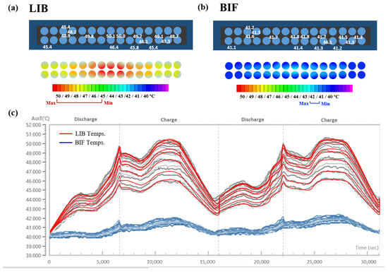 Figure 7b shows the temperature changes in the LIB cell and BIF cell during cycling. During discharge, the exothermic reaction, activation polarization at the beginning, and concentration polarization at the end rapidly increased the current [48,49,50,51]. At this time, the impedance of the cell increased and decreased significantly in the constant-voltage charge step compared to the constant-current charge. These factors account for the temperature variations [52].