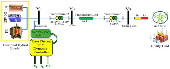 Figure 8 shows the sample research AC system along with a certain supplementary component, FACTS-MFCC. It is connected to the infinite bus −138 kv and to a substation bus through the 10 km feeder, and it consists of a local hybrid load, which includes linear, nonlinear, and induction motor-type loads. Appendix A and Appendix B show the unified AC system, FACTS-MFCC, and the dynamic control parameters, respectively.