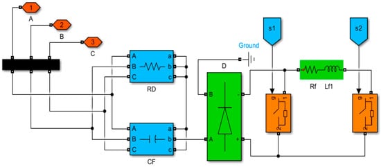 The proposed low-cost FACTS-MFCC-SFC dynamic voltage stabilization device is a member of the switched capacitor compensator and modulated switching/modulated power filter family [22]. Using a double-switched shunt capacitor bank and two shunt-linked fixed capacitors for the proposed FACTS-MFCC-SFC minimizes the overall harmonics distortion and improves power quality and the power factor. Moreover, the system’s ground is linked to a tuned arm filter to improve the overall performance. The FACTS-MFCC-SFC has two modes of operation: a capacitive compensation mode and a tuned arm filter mode that utilizes the controlled IGPT switches S1 and S2, as shown in Figure 2.