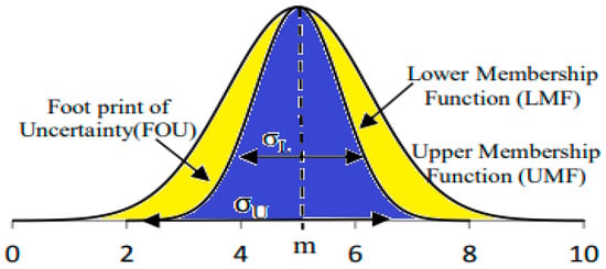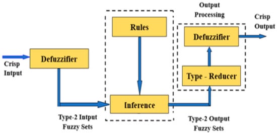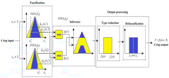 The input type-2 fuzzy sets are created by fuzzifying the crisp inputs from the input sensors. Since singleton fuzzification is easy to apply and works well with embedded processors and real-time applications, it is typically employed in interval type-2 FLC applications [31]. The inference engine and the rule base are then triggered by the input type-2 fuzzy sets to generate output type-2 fuzzy sets, as shown in Figure 5 [32].
