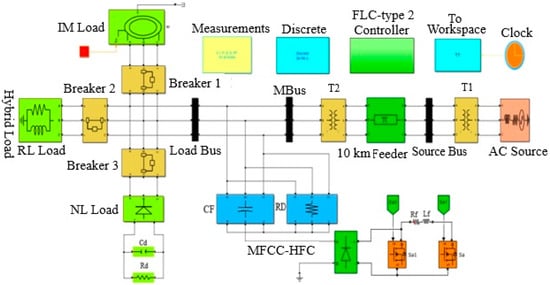 A single-line diagram of an AC system sample study of three-phase AC system supplying loads is shown in Figure 1. Figure 2 shows the FACTS-MFCC-SFC scheme of the AC three-phase system grid network. It represents the Simulink MATLAB software of the novel dynamic error-driven tri-loop FLC applied to lower switching transients, current inrush excursions, as well as in the low voltage utilization system for effective power/energy utilization and power quality improvement for the type of load depicted in [18].