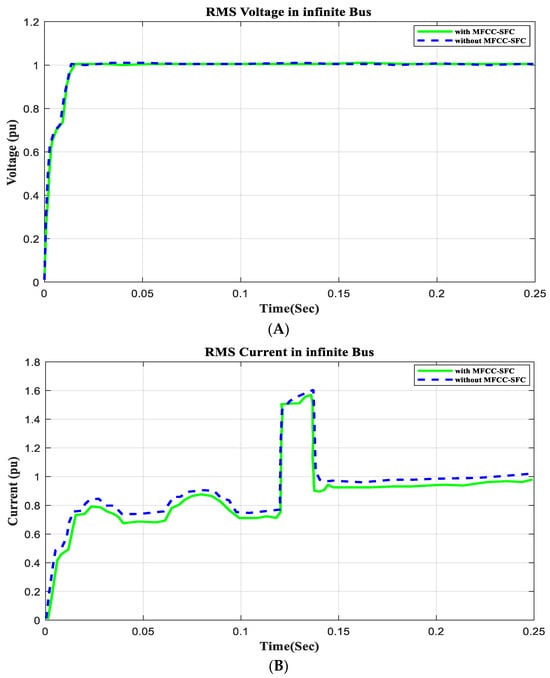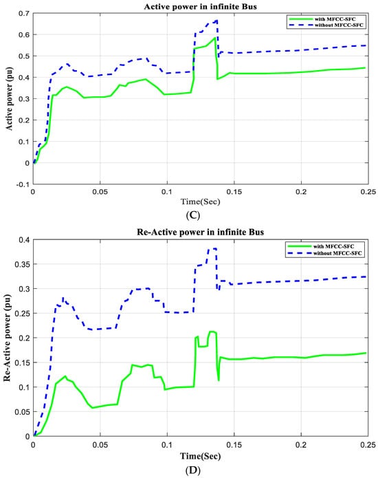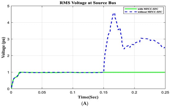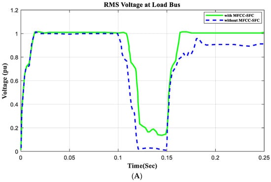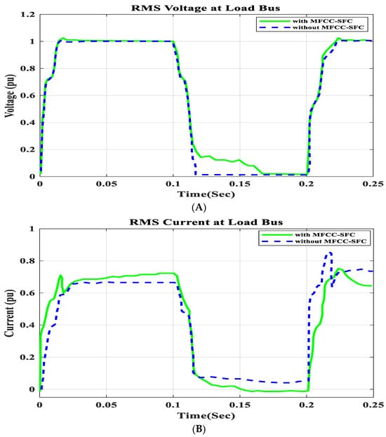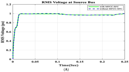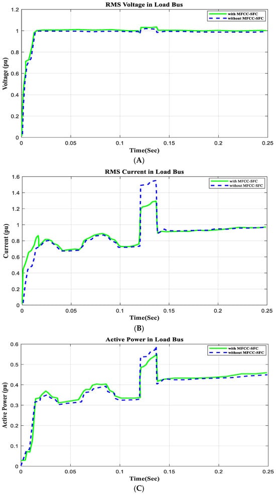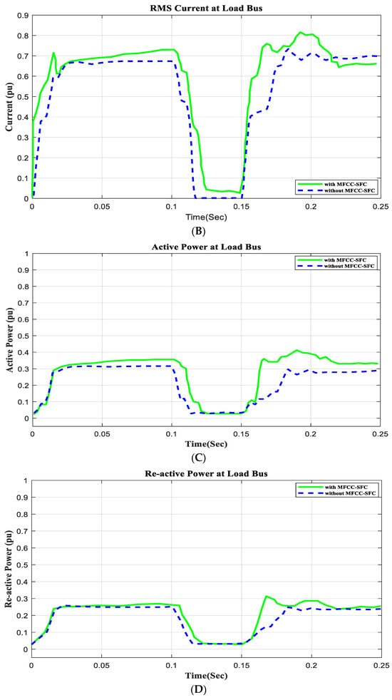 To demonstrate that the low-cost FACTS-MFCC scheme involving dynamic stabilization and efficient energy utilization works as intended, the proposed control schemes for stabilizing the host smart grid under a short circuit (SC), open circuit (OC), and other conditions were tested. All digital simulations used the MATLAB/SIMULINK-2023b software environment, which introduced a three-phase short circuit to the load bus of the AC grid at a time of 100 ms and cleared it after 200 ms. Figure 9 and Figure 10 demonstrate the outcomes of the simulations under the short circuit situation. Furthermore, the FACTS-MFCC-SFC scheme improved its efficiency in lowering inrush currents during short- and open-circuit failures, which helped enhance the power factor and stabilize bus voltages in the case study.