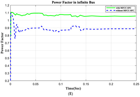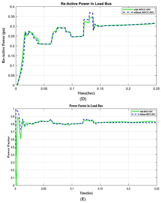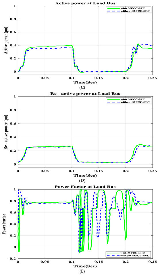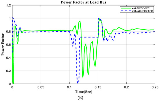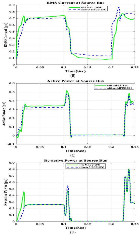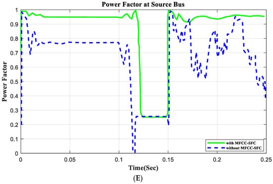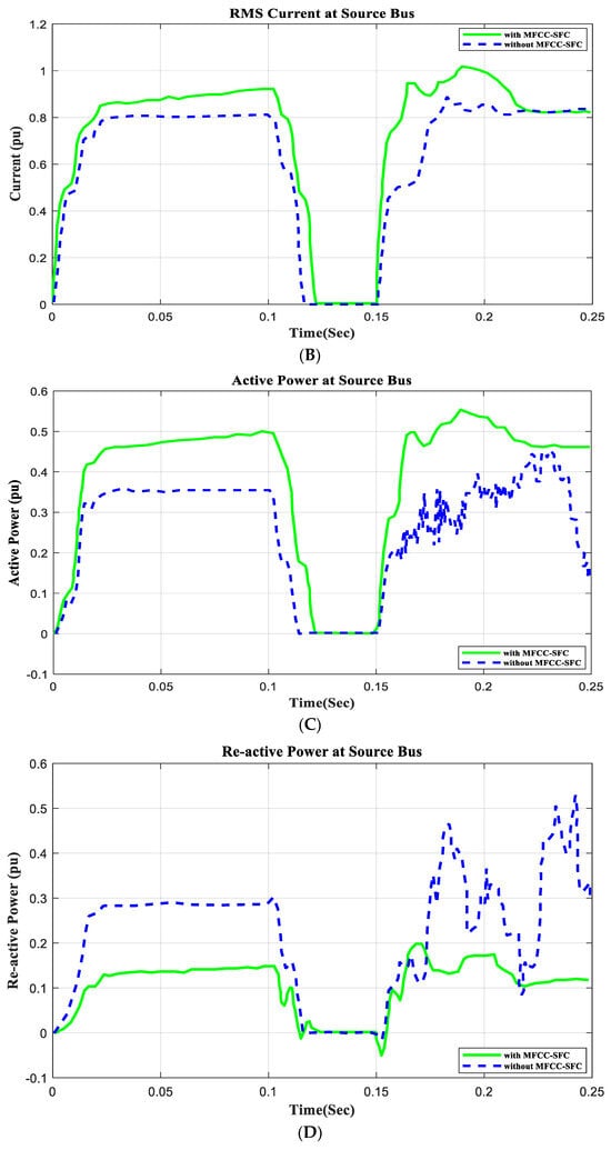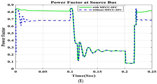 In this section, an open circuit occurs close to the load, and the alteration in a critical parameter is demonstrated. All digital simulations used the MATLAB/SIMULINK-2023b software environment, which introduced a three-phase open circuit to both buses (source and load) of the AC grid at a time of 100 ms and cleared it after 150 ms. Figure 11 and Figure 12 demonstrate the outcomes of the simulations under the open-circuit situation. Furthermore, as can be seen, both buses (source and load) now have better dynamic response and power quality. Additionally, there are not many fluctuations in the power factor in open-circuit faults with FACTS-MFCC-SFC in essential buses, particularly in source buses.