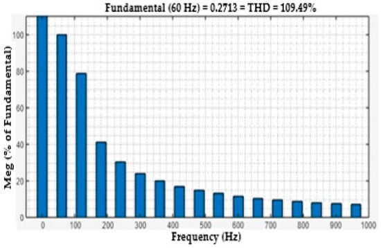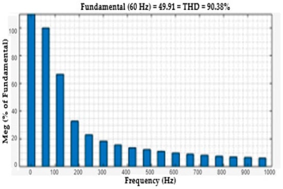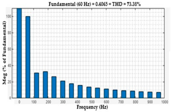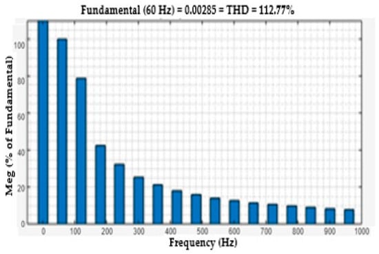 One useful metric for estimating the harmonics in voltage or current waveforms is the total harmonic distortion or THD. The harmonics effect of the voltage and current load bus are discussed in this section. The voltage THDs of the load bus without FACTS-MFCC-SFC as a function of time is seen in Figure 15. The rate of THD increased for constant series compensation, as shown in Figure 15, because the nonlinear loads are used on power systems; however, the THD of the voltage in the load bus was improved, as shown in Figure 16, by employing the FACTS-MFCC-SFC. The current THDs of the load bus without FACTS-MFCC-SFC as a function of time is seen in Figure 17. The rate of THD increased for constant series compensation, as shown in Figure 17 because the nonlinear loads are used on power systems; however, the THD of the current in the load bus was improved, as shown in Figure 18, by employing the FACTS-MFCC-SFC [33]. All variables values are shown in Appendix A and Appendix B.