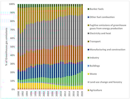- Ritchie, H.; Rosado, P.; Roser, M. Emissions by Sector: Where Do Greenhouse Gases Come From? Our World in Data. 2020. Available online: https://ourworldindata.org/emissions-by-sector (accessed on 10 February 2024).