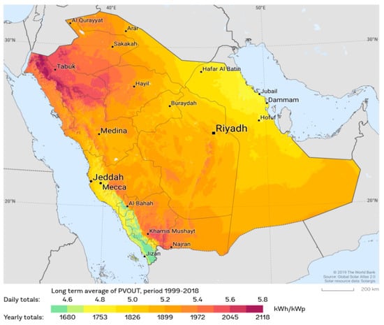 - G.S.A. Global Photovoltaic Power Potential Study. “Saudi Arabia”. SolarGis. Available online: https://databank.worldbank.org/reports.aspx?source=3001&series= (accessed on 10 February 2024).