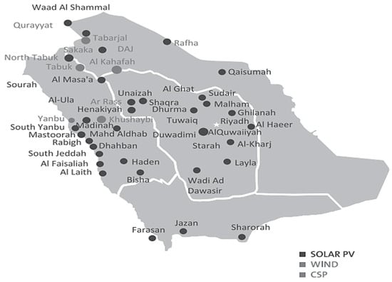 - Renewable Project Development Office. The Kingdom of Saudi Arabia National Renewable Energy Program; Renewable Project Development Office: Riyadh, Saudi Arabia, 2017. [Google Scholar]