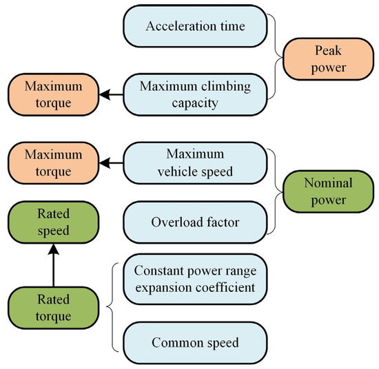 The determination principle for the total power requirement of an articulated bus is similar to that of a traditional bus, both of which are determined according to the power performance of the whole vehicle. Usually, the maximum power of the drive motor is determined by the highest speed, the acceleration performance index, and the maximum gradeability. The power design flow of the power system is shown in Figure 1.