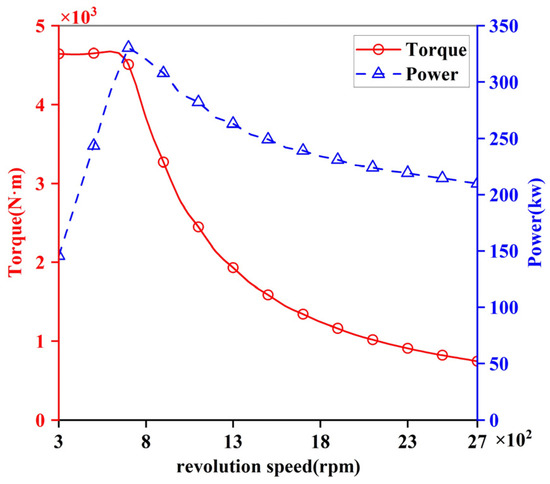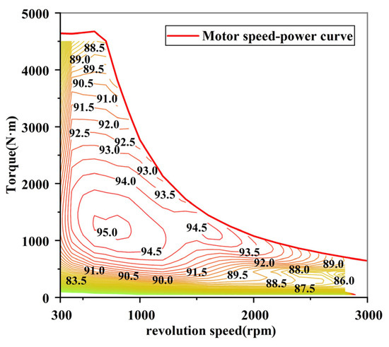 This paper researches a triaxial two-axle drive articulated passenger car. The external characteristic curve of the drive motor is selected through testing, as shown in Figure 2, and the power map distribution of the drive motor is given, as shown in Figure 3.