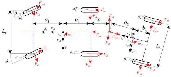 In recent years, the dynamic modeling of articulated buses during the braking and steering process has attracted extensive attention from scholars. The transverse dynamics of multi-axle and multi-articulated vehicles have been analyzed, and with that, a linear planar dynamic model of an articulated vehicle came to be established [1]. The authors of [2] established a simplified model for the yaw and roll of articulated buses and corrected the key parameters of the simplified model based on the real-time state of the vehicle. In [3], Shen et al. proposed a rigid differential steering mode for articulated vehicles and analyzed the vehicle steering behavior in a composite steering mode with hydraulic steering as the main method and differential steering as the auxiliary method. The dynamic model for each subsystem of articulated loaders was established. In addition, the vehicle mechanical dynamics and steering behaviors under predetermined paths were provided in [4]. A polyhedral vehicle model considering uncertain parameters was established, and the active trailer steering behaviors of multi-trailer articulated heavy vehicles were studied [5]. Combined with the nonlinear yaw model of the articulated dump truck, Rakheja et al. [6] established the kinematic and dynamic model of the steering mechanism of the vehicle frame. In addition, the influence of the change in the effective damping applied to the steering mechanism on the response of the steering system under stable steering and pulse steering input has been researched. A dynamic model for the hydraulic steering system of articulated heavy vehicles was established, and the performance of the vehicle steering was analyzed [7]. A Jacobian linearized kinematics model of an articulated vehicle based on the geometric structure characteristics of articulated vehicles was established, and the steering motion performance of an articulated vehicle was studied [8]. A vehicle motion model considering body roll and centroid bias was established, and the effect of the centroid bias in the front and rear carriages on the vehicle handling stability was discussed [9].
