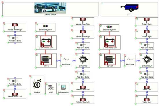 Based on the longitudinal and transverse coupling dynamic model of an articulated bus, a simulation model was constructed using Cruise simulation software, as shown in Figure 6.