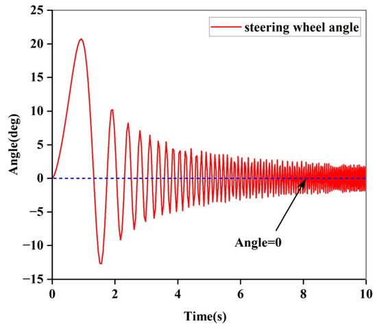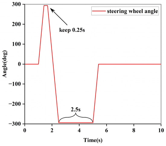In Figure 7, the driver’s steering wheel angle is rotated counterclockwise to +294° and kept for 0.25 s; then, it is rotated clockwise to −294° and kept for 2.5 s, and the steering wheel is reset. Finally, the steering wheel angle is kept unchanged. This operation simulated the turning condition of the bus on a narrow road, and the vehicle data are obtained as shown in Figure 8.